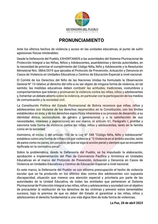 Defensoria del Pueblo emite un pronunciamiento contra el bulling y todo tipo de violencia generada en las unidades educativas