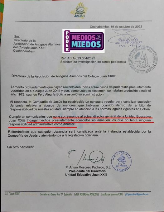 Exclusivo. Así negaron en la Compañía de Jesús (los jesuitas) investigar las denuncias de pederastia, ante el pedido de la Asociación de ex alumnos del Colegio Juan XXIII. Firma la negativa el padre Arturo Moscoso, actual director del Colegio San Ignacio de La Paz.