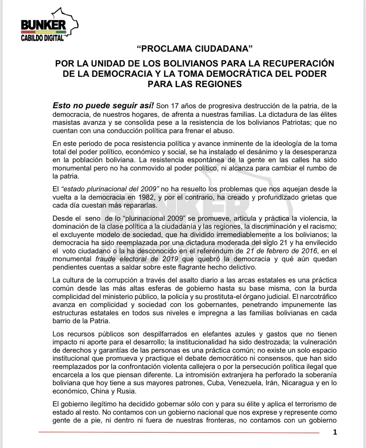 Los activistas, Pamela Flores, Agustín Zambrana y otros, se unieron en fuerzas junto a Plataformas ciudadanas, ciudadanos de a pie, bunkeros y organizaciones vivas y presentan la primera Proclama Ciudadana: “POR LA UNIDAD DE LOS BOLIVIANOS PARA LA RECUPERACIÓN DE LA DEMOCRACIA Y LA TOMA DEMOCRÁTICA DEL PODER PARA LAS REGIONES”!!