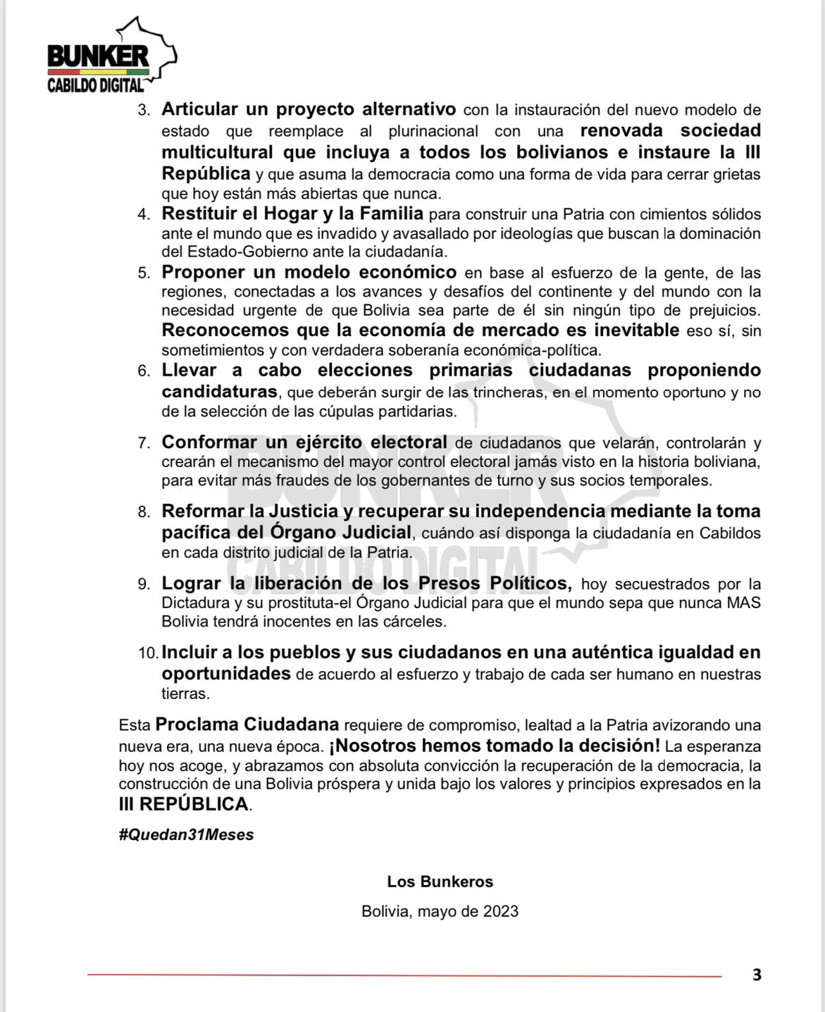 «Nos adherimos a está Proclama como bunkeros. La Proclama trae un nuevo modelo de Estado e ingresar a la era de la Tercera Republica», señaló Zambrana.