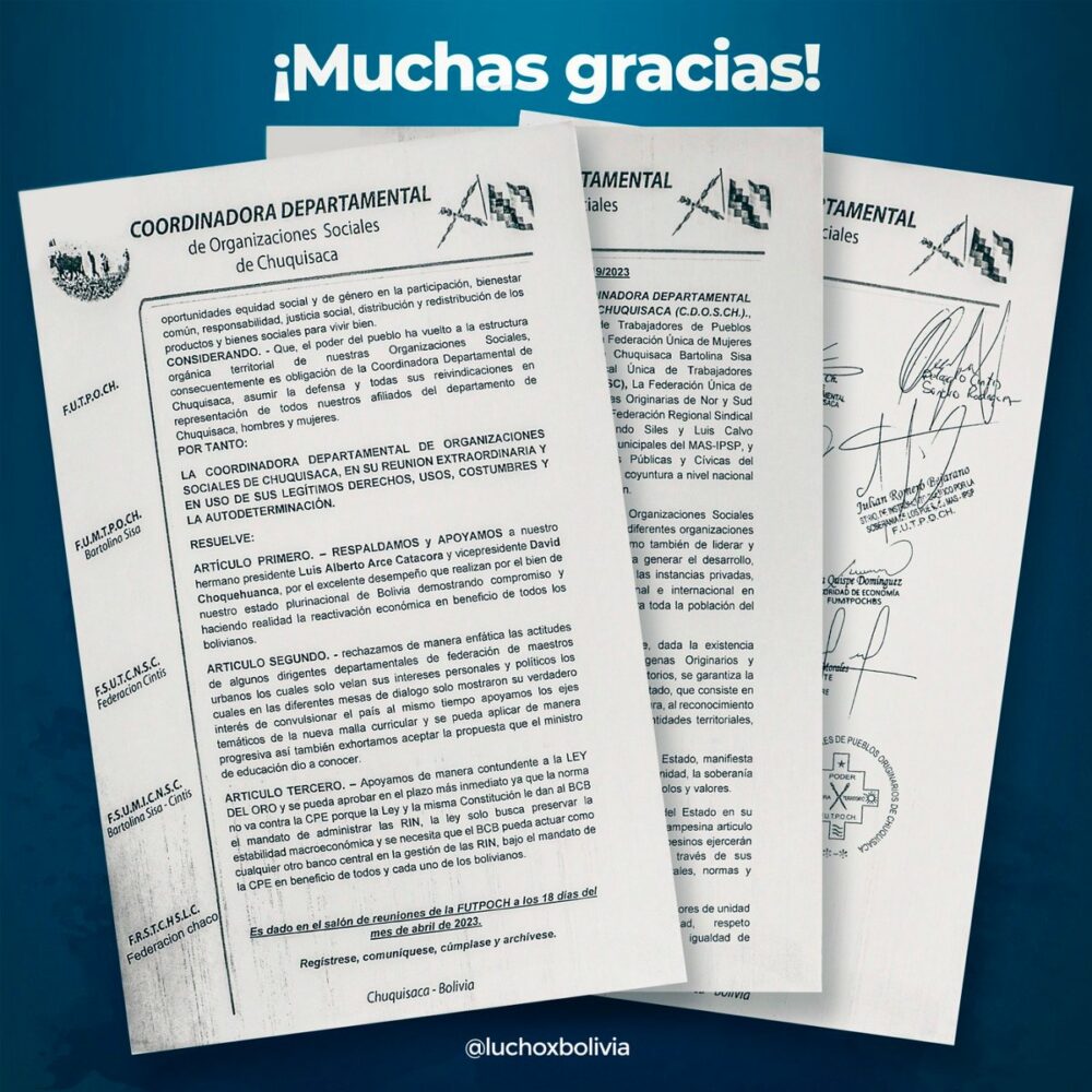 La unidad del pueblo boliviano es fundamental para defender nuestra democracia y nuestros recursos naturales, que vuelven a despertar el interés de la derecha nacional e internacional. Agradecemos el apoyo de la Coordinadora Departamental de Organizaciones Sociales de Chuquisaca. https://t.co/S2Jid4Balm