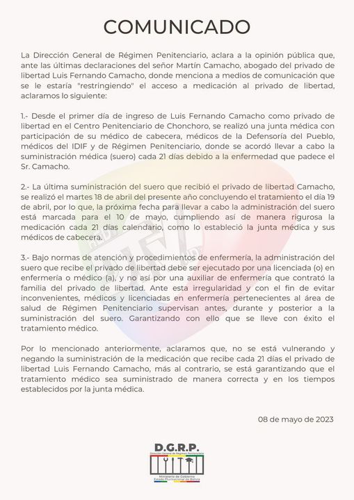 Régimen Penitenciario emite Comunicado rechazando se esté impidiendo tratamiento médico riguroso a gobernador CamachoCategorías NoticiasEtiquetas , Detrás de la Verdad, DTV, Facebook 08/05/2023 [vid_embed] Fuente: DTV => Recibir por Whatsapp las noticias destacadas