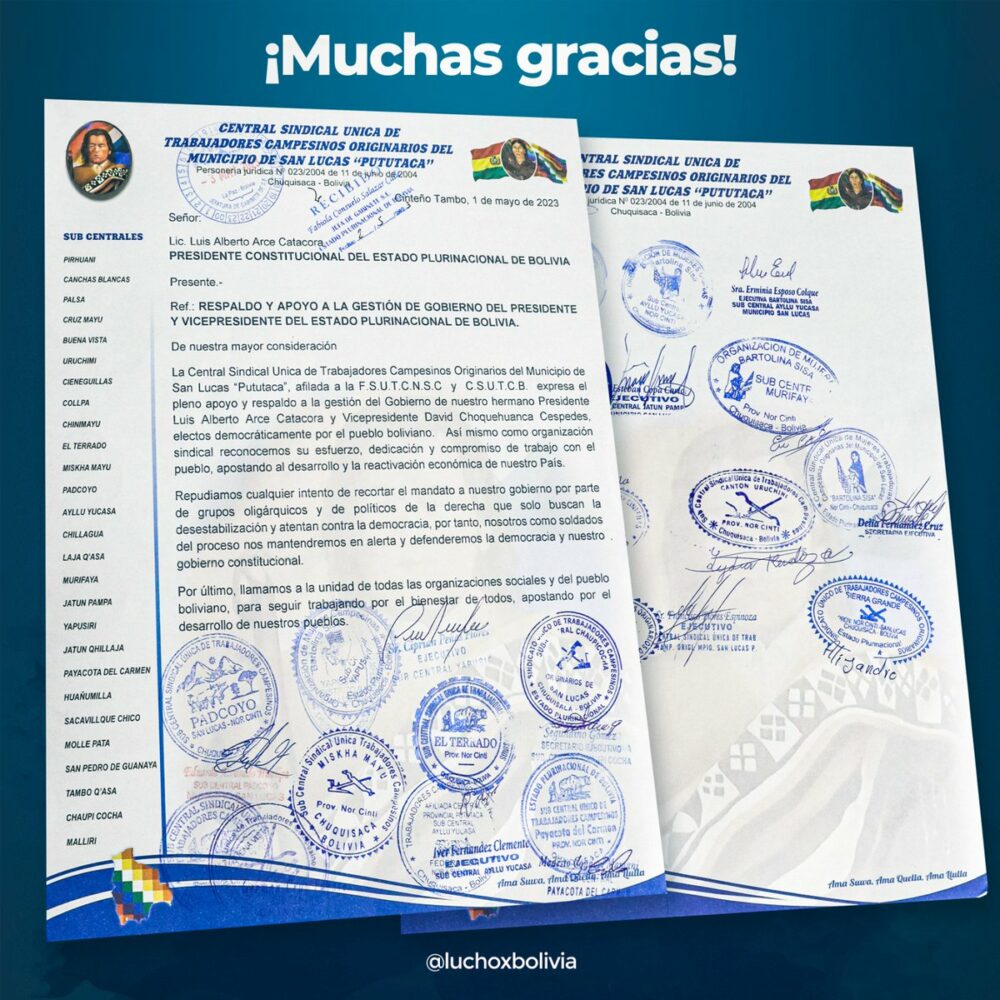 No tenemos la menor duda de que la lucidez política y compromiso revolucionario de nuestras organizaciones sociales, son garantía de la democracia. Agradecemos el apoyo de la Central Sindical Única de Trabajadores Campesinos Originarios de San Lucas «Pututaca», en #Chuquisaca. https://t.co/SkUyexiHWS