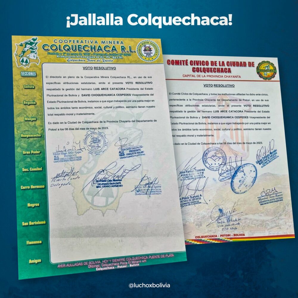 La unidad y el trabajo de nuestras organizaciones sociales, son el pilar de la democracia y el motor de la estabilidad económica. Agradecemos el respaldo constante del Comité Cívico de Colquechaca y de la Cooperativa Minera Colquechaca del departamento de #Potosí. https://t.co/P8XExMFGCB