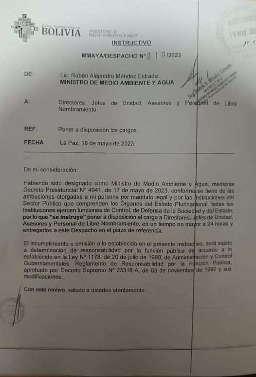 Nuevo ministro de Medio Ambiente instruyó poner en 24 horas sus cargos a disposición a todos los Directores , Jefes de Unidad, Asesores y personal de libre nombramiento.