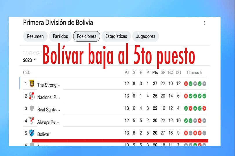 Bolívar baja al 5to puesto. Equipos de mucho menor presupuesto y con muchas menos figuras, como Nacional Potosí o Real Santa Cruz, aparecen mejor ubicados que los celestes.