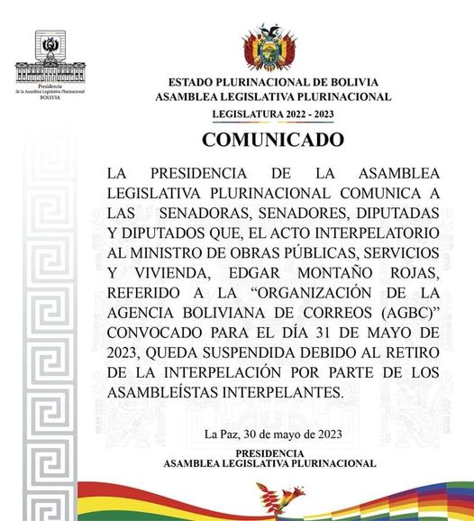 Suspenden interpelación a ministro de obras públicas para el miércoles 31 porque interpelantes retiraron su peticiónCategorías NoticiasEtiquetas 30/05/2023 [vid_embed] Fuente: DTV