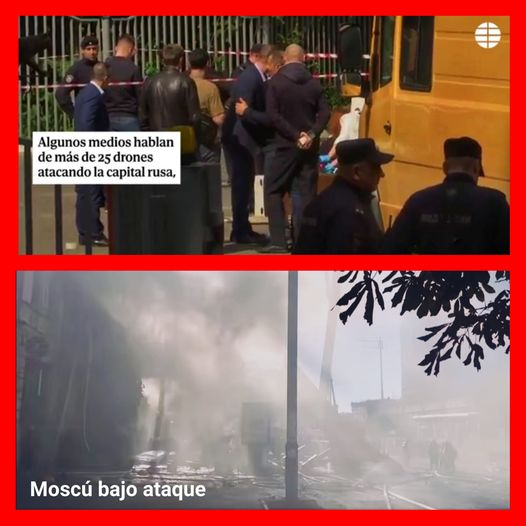 DRONES CONTRA BARRIOS DE MOSCÚ Algunos medios hablan de más de 25 drones atacando la capital rusa casi al mismo tiempo. 🔥El Ministerio de Defensa dijo que ocho drones con forma de avión fueron destruidos por los sistemas de defensa aérea. 📹Hay imágenes de edificios de apartamentos afectados, bien porque eran objetivo o porque recibieron el impacto de los drones cuando fueron desviados o derribados por las defensas rusas. La operación 💥 se produce pocas semanas después de que el Kremlin fuera atacado con unos drones que Rusia relaciona con Ucrania y cuya responsabilidad, como siempre que ataca territorio ruso, Kiev negó.