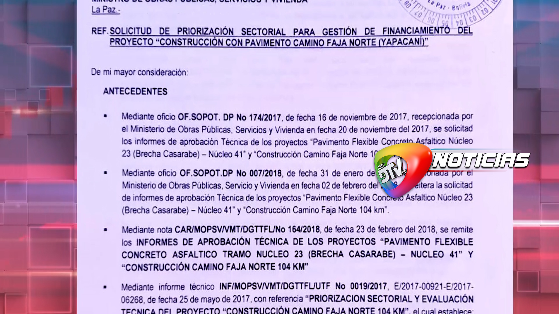 Desde la Gobernación a través del director de Obras Públicas Fernando Terceros, señalan que ya tienen la documentación firmada por el Gobernador Luis Fernando y ya lo han enviado al Ministro de Obras Públicas para que también lo firme, para así darle solución al conflicto de Faja Norte Yapacani, esta autoridad señala que como Gobernación han cumplido todos los procedimientos y que ahora esta en manos del Ministro Montaño firmar e iniciar ese trámite para priorizar la construcción de esa carretera y así poder buscar el financiamiento, destaca que esta institución ya no tiene nada que hacer y consideran que el bloqueo ya debe ser levantado