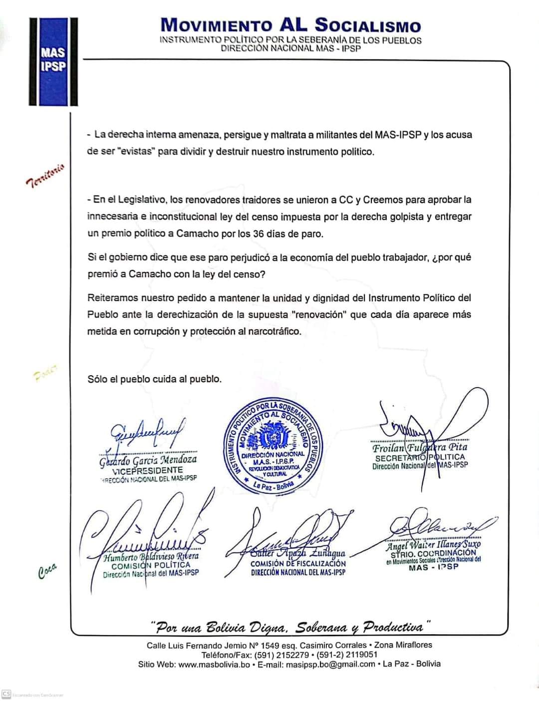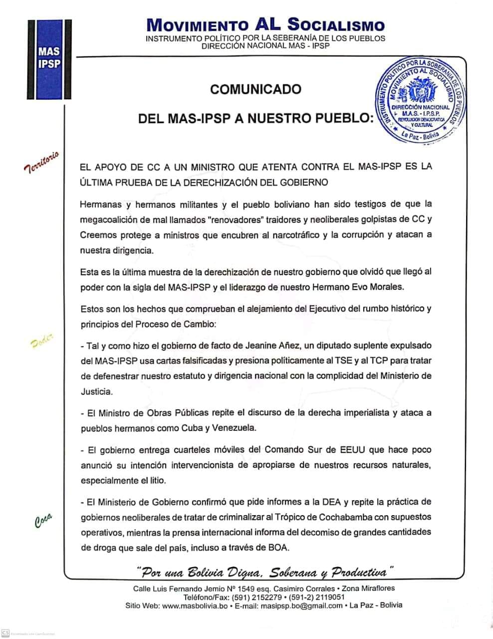 Mediante un comunicado, el Movimiento al Socialismo, cuestionó que la senadora Silvia Salame (CC), haya apoyado la no censura del Ministro de Justicia Iván Lima, en la última interpelación en la Asamblea Legislativa. Aseguró que esa es un prueba clara que el Gobierno del Presidente Luis Arce se va «derechizando» luego se recibir el apoyo de la oposición.