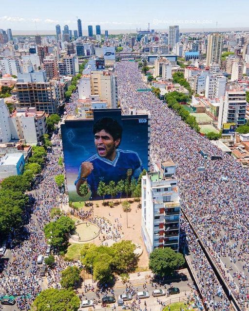 Hermosa imagen. Argentina festejaba su título mundial 2022. Y Diego estaba presente, en medio de la multitud, en ese enorme y bello mural. Nunca falta.