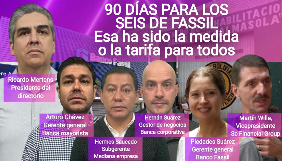 miembros de Fassil que deben defenderse desde la cárcel. Entre ellos el presidente, el vicepresidente y la gerente general.Martin Wille, vicepresidente, fue hoy el último en ser enviado a Palmasola. Aunque deberá pasar siete días primero en una clínica, por su estado de salud, afectado por el momento que atraviesa.