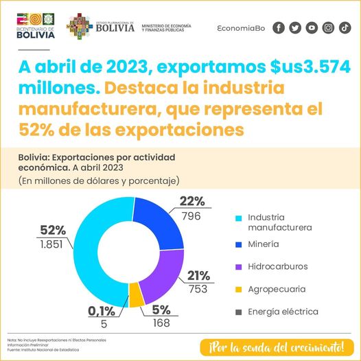 Hasta abril de 2023 las exportaciones bolivianas alcanzaron los 3.574 millones de dólares.