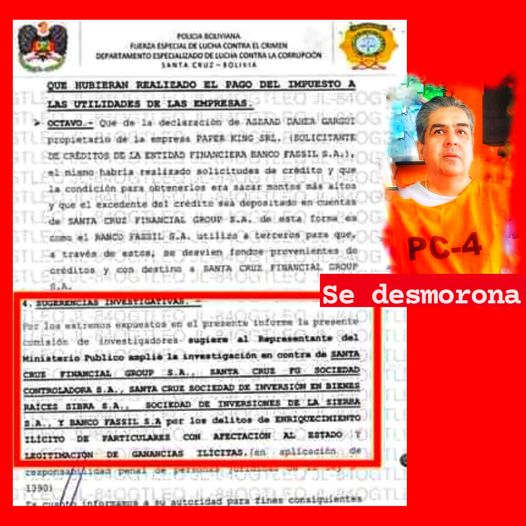La fiscalía considera que los indicios de operaciones sospechosas encontradas presumen la probable participación del ciudadano Juan Ricardo Mertens Olmos y las empresas Santa Cruz Financial Group S.A., Santa Cruz FG Sociedad Controladora S.A., Santa Cruz Sociedad de Inversión en Bienes Raíces Sibra S.A.. Sociedad de inversiones de La Sierra S.A., y Banco Fassil S.A, pues como se tiene señalado, la empresa Santa Cruz Fg Sociedad Controladora S.A., dirige, administra, controla y representa a las Empresas Financieras integrantes del Grupo Financiero: «Banco Fassil S.A.», «Santa Cruz Securities», “Santa Cruz Investments» y «Santa Cruz Vida y Salud».