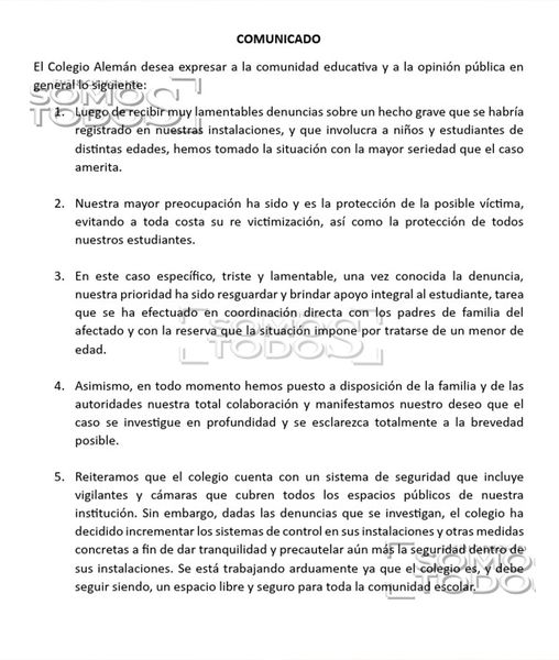 El establecimiento educativo donde investigan una presunta violación por parte de estudiantes a un menor de 12 años en la capital cruceña. Se pronunció mediante el siguiente comunicado.