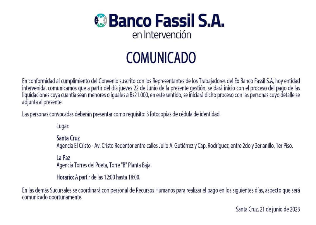 El ex Banco Fassil comienza a pagar a sus ex trabajadores mañana. Se empieza con quienes deben cobrar liquidaciones de menos de Bs 21 mil. Acá, todos los detalles.