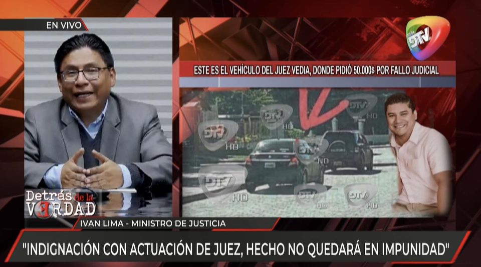 El ministro de Justicia, Iván Lima, asegura que acompañaran las investigaciones tanto en la vía penal como por la vía administrativa contra quienes estarían implicados en el caso de presunta corrupción, ala que habría incurrido el juez Vedia quien presuntamente habría solicitado 50.000 dólares para favorecer al empresario Rodrigo Gutiérrez en un proceso penal.