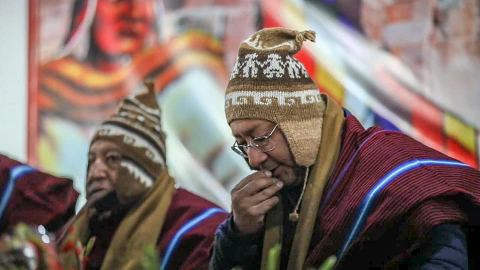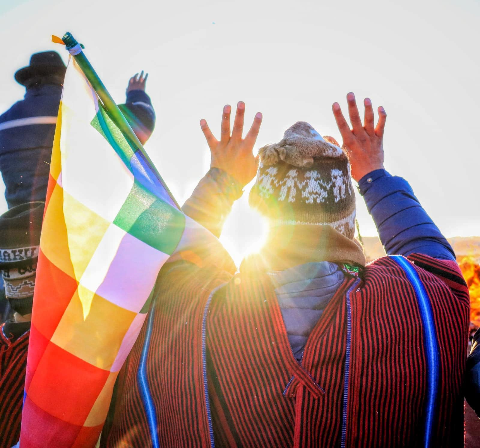 “Con el firme deseo de salud y progreso, recibimos los primeros rayos del sol del 5.531 Año Nuevo Andino, Amazónico y del Chaco, en #Tiwanaku. Estamos seguros