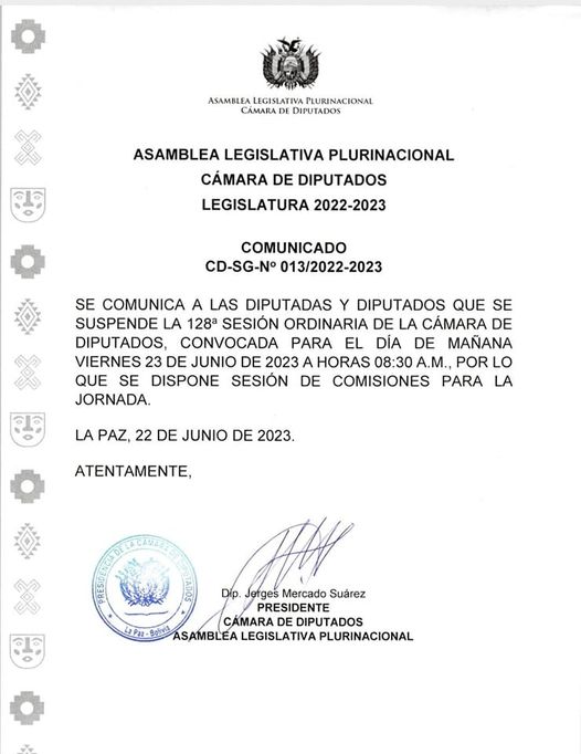 Mediante un comunicado, la Cámara de Diputados suspendió la sesión plenaria programada para la mañana de este viernes.