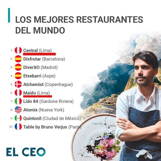El mejor restaurante del mundo está en Lima, Perú. Es Central, del chef Virgilio Martínez (foto). Por primera vez el mejor restaurante del planeta está en Latinoamérica. Lima tiene dos de los mejores diez. Maido, del chef Micha Tsumura, ocupa la sexta posición. Qué delicia, Perú 🇵🇪