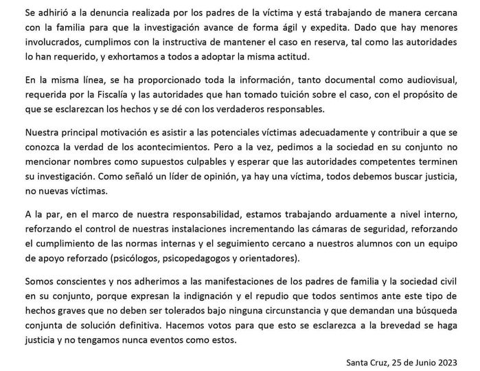 Santa cruz, Colegio privado Alemán pide no dar nombres de los presuntos culpables de la agresión sexual y que se espere el trabajo investigativo de las autoridades