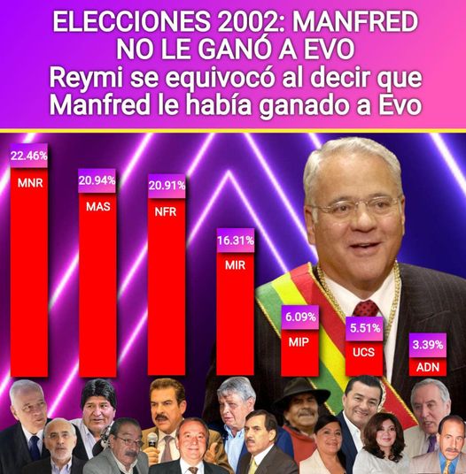 Miren quiénes eran los candidatos!! Año 2002, las últimas elecciones con el protagonismo del viejo sistema de partidos. Agonizaban el MNR, MIR, ADN. La gente ya no se sentía representada por ellos. Goni ganaba con el 22%, de milagro y desgastado, y no iba a poder terminar su mandato.