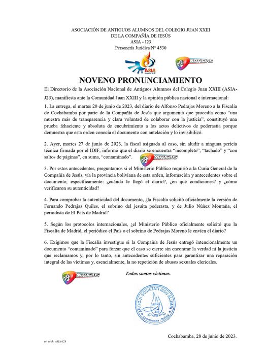 Mediante un comunicado, la Asociación Nacional de Antiguos Alumnos del Colegio Juan XXIII, se pronunció sobre el diario del padre pederastas Pedrajas, instando a la Fiscalía que indague si la Compañía de Jesús entrego el documento alterado, para forzar el cierre del caso sin justicia ni verdad.