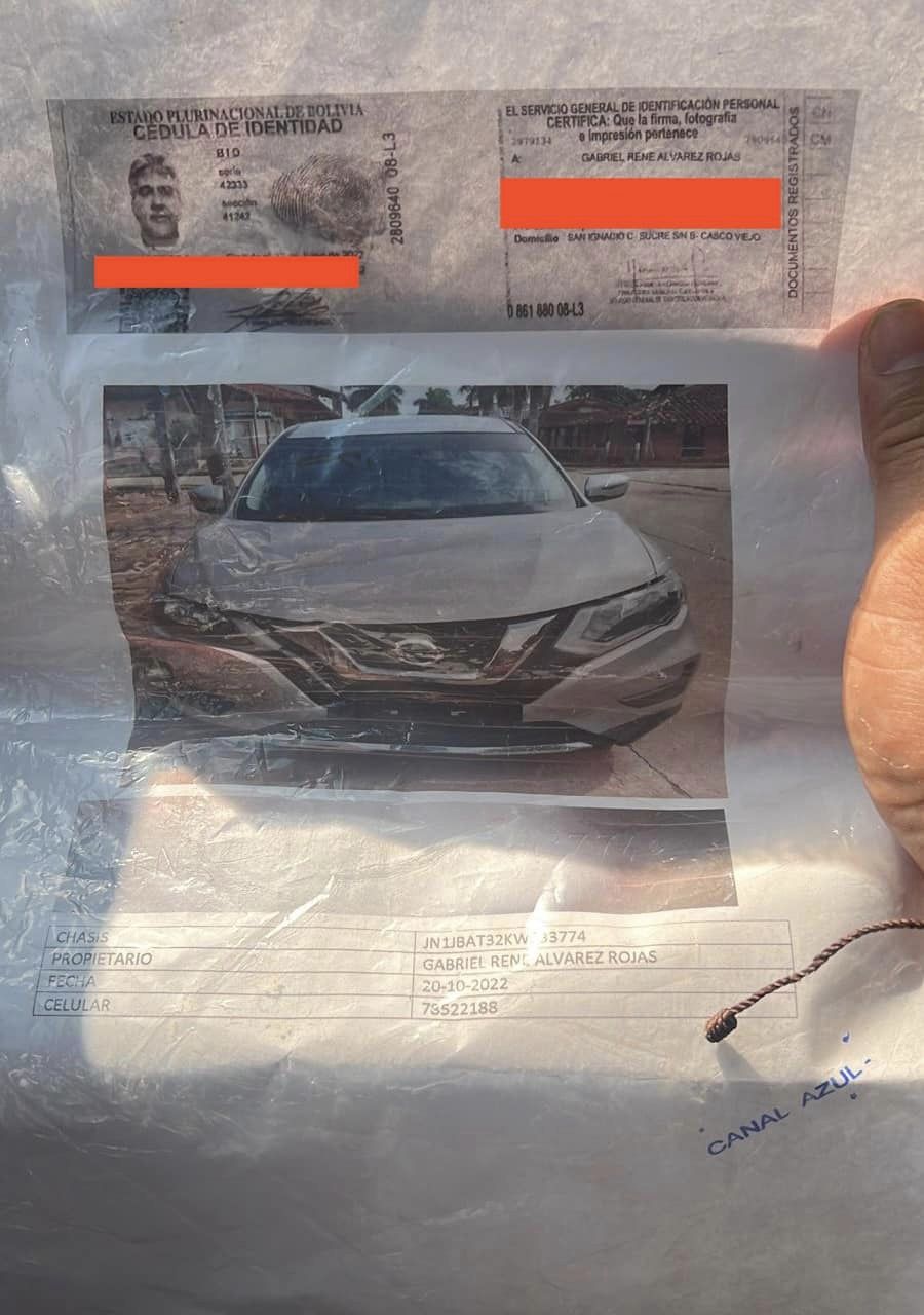 De acuerdo al reporte de la policía la vagoneta NISSAN Xtrail CVT 2.5 sin placas, salió de la casa de la madre de la diputada de Creemos, Maria Rene Alvarez y era conducido por el padre de la asambleísta nacional, el vehículo está reportado como robado en Chile desde el 31 de marzo del 2022.