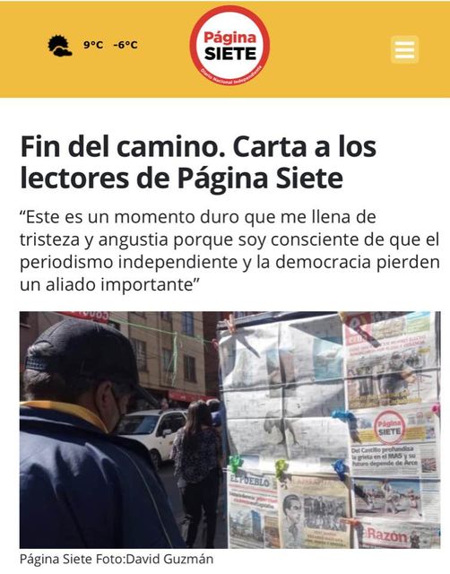 Se cierra Página Siete. Una voz menos, un diario menos, una fuente de empleos menos. Tristeza por los colegas y por todas las personas que se quedan sin trabajo. También porque la democracia necesita voces múltiples, posiciones diferentes y miradas plurales.