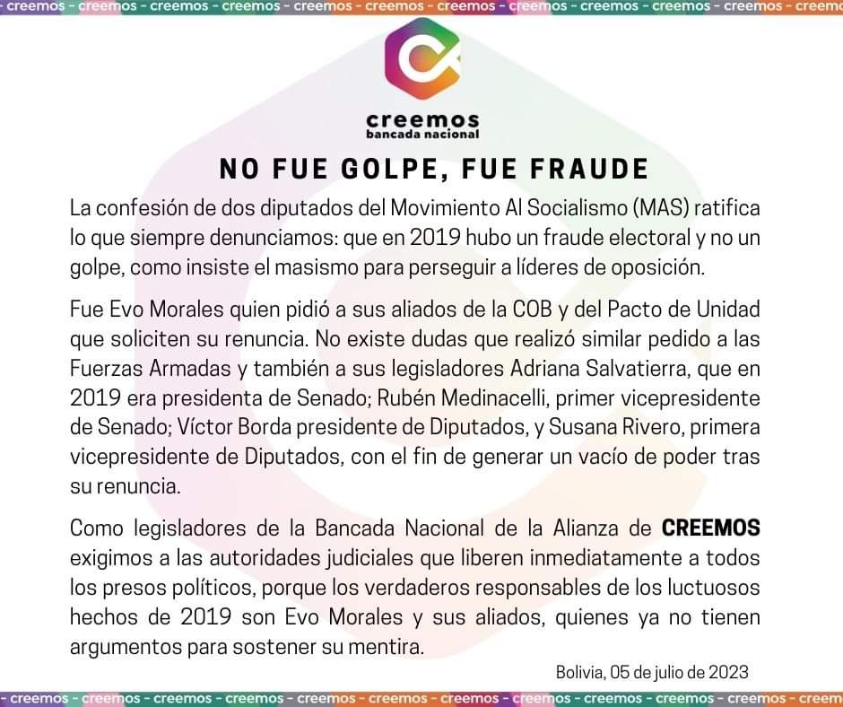 🔵 | Los legisladores de la bancada de Creemos exigen a las autoridades judiciales que liberen a «todos los presos políticos» porque «los verdaderos responsables de los luctuosos hechos de 2019 son Evo Morales y sus aliados». https://t.co/ljvoCq9j2f