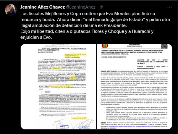🔵 | Tras conocerse que Evo Morales pidió a organizaciones solicitar su renuncia en 2019, Jeanine Añez denuncia que la Fiscalía solicitó «otra ilegal ampliación de detención de una expresidente». «Exijo mi libertad», tuiteó. pic.twitter.com/0h5v2RFjWs