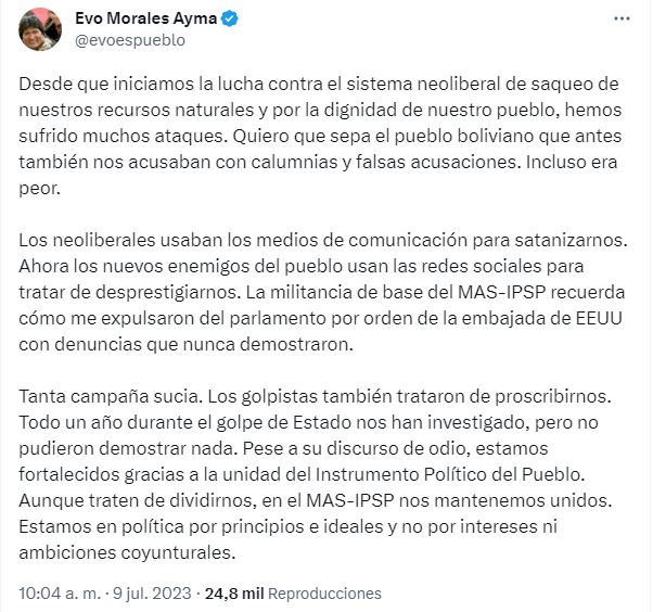 🔵 | ítica El expresidente y jefe del MAS, @evoespueblo, recordó que desde que inició en la vida sindical y política fue blanco de ataques por el sistema neoliberal. Afirmó que lo investigaron en 2020, pero no lograron comprobar ninguna acusación en su contra. https://t.co/E05bkvpm80
