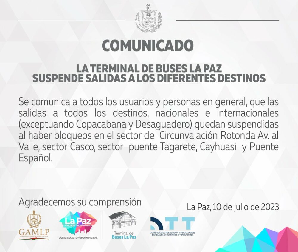 🔵 | La Terminal de Buses de informa que las salidas a todos los destinos nacionales e internacionales, excepto Copacabana y Desaguadero, quedan suspendidas debido a bloqueos en varios sectores de la carretera a . pic.twitter.com/DLqXvdPLbu