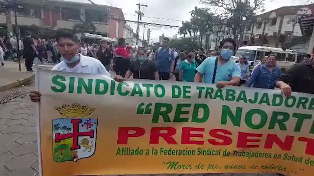 🔵 | Trabajadores en salud marchan en el centro de la ciudad de en demanda del pago de salarios del personal que fue contratado con recursos del TGN. Asimismo, piden una mejor atención en la CNS y la Caja Bancaria donde están afiliados. (Video: El Deber) https://t.co/V8MXXd6WHA