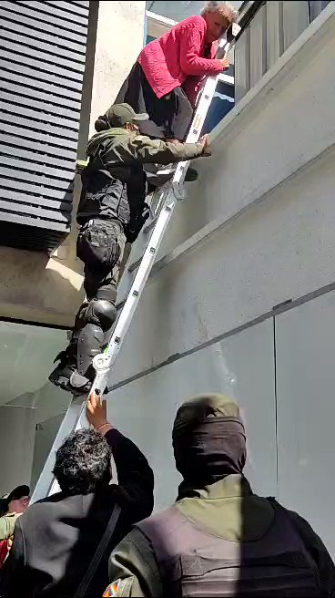 🔵 | Amparo Carvajal, con la ayuda de una escalera, intenta ingresar a la sede de la Asamblea Permanente de Derechos Humanos de (APDHB) que fue tomada hace más de un mes por una directiva paralela afĂn al MAS. pic.twitter.com/KoNRBM5KzA