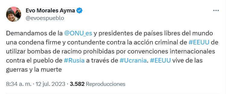A través de su cuenta de Twitter, el expresidente Evo Morales demandó una “condena firme y contundente” al lanzamiento de bombas prohibidas por convenciones internacionales contra Rusia.