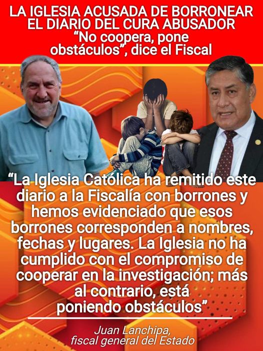 La Iglesia acusada de borronear el diario del cura abusador. Borraron nombres, fechas y lugares. La fiscalía la acusa de no cooperar y poner obstáculos en la investigación de los casos de pederastia de curas contra menores.