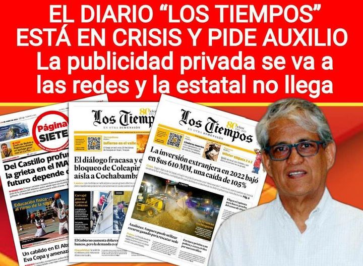 El diario “Los Tiempos”, de Cochabamba, está en crisis y pide auxilio. La publicidad privada se va a las redes y la estatal no le llega. Su gerente general dirigió un mensaje en redes sociales, pidiendo que la sociedad valore el aporte del diario al país y a la democracia y que se los apoye.
