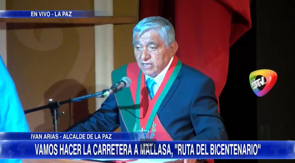 El alcalde Iván Arias, durante la Sesión de Honor efectuada en el Teatro Municipal Alberto Saavedra Pérez, anunció la construcción de la carretera a Mallasa, la cual denominó la “ruta del Bicentenario”
