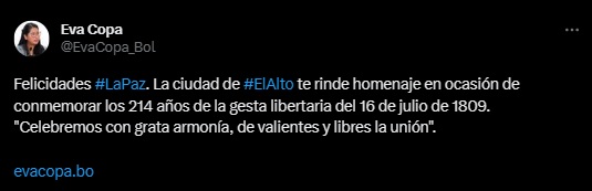 Mediante Twitter, la alcaldesa de El Alto, Eva Copa, felicita también a La Paz por sus 214 años de gesta libertaria.Categorías NoticiasEtiquetas 16/07/2023 [vid_embed] Fuente: DTV => Recibir por Whatsapp las noticias destacadas