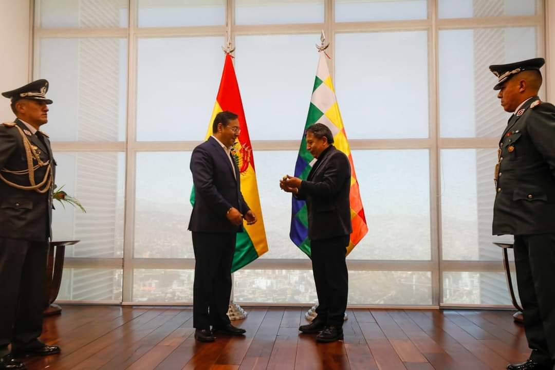 Entregamos el Bastón de Mando a nuestro jilata vicepresidente David Choquehuanca, antes de viajar a Bruselas, Bélgica, para participar de la III Cumbre de Jefas y Jefes de Estado y de Gobierno de la CELAC-UE. Debemos construir puentes de unidad para encarar los desafíos globales.