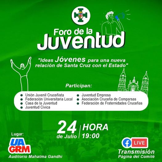 Este lunes 24 de julio, llevaremos a cabo el FORO «Ideas jóvenes para una nueva relación de Santa Cruz con el Estado», por lo que convocamos a toda la JUVENTUD cruceña a participar en este importante encuentro.