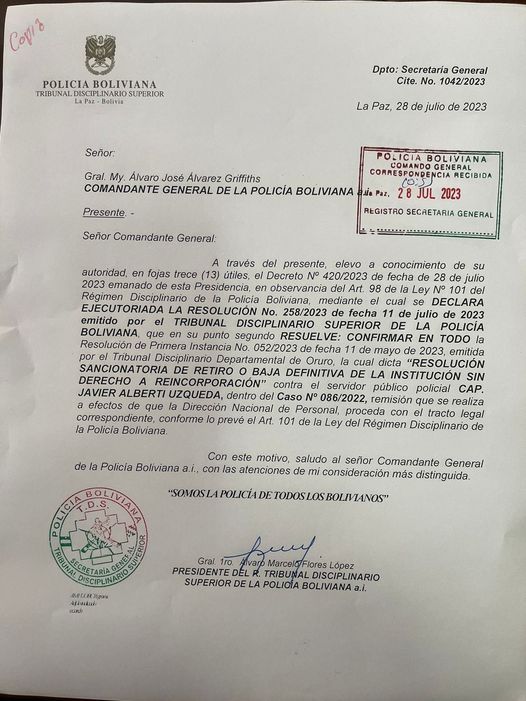 El documento emitido por la institución del orden resuelve confirmar la resolución “sancionatoria de retiro o baja definitiva de la institución sin derecho a reincorporación contra el servidor público, capitán Javier Alberti Uzquieda”.