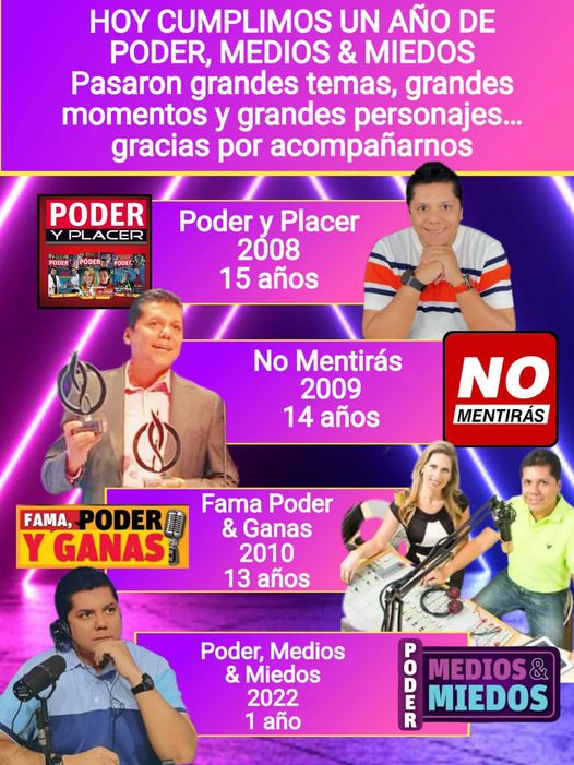 Y son muchos años haciendo periodismo. Hoy, con cuatro productos periodísticos vigentes: van 15 años de Poder y Placer, 14 años de No Mentiras 4.0, 10 años de Fama Poder y Ganas y un año muy importante de este nuevo programa.