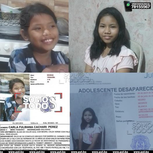 Según el reporte de extravío la menor de 8 años de nombre Carla Fulbiana Cachari Perez, salió de su casa en la zona de la Pampa de la Isla en el barrio Carmen II, acompañada de su hermana Dailin Mayarid de 13 años el pasado 30 de Julio, sus padres desesperados, piden ayuda para encontrarlas, si ud conoce algún dato puede llamar a: