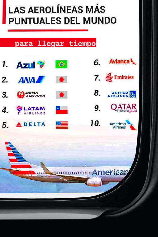 EL TIEMPO ⏳ VALE ORO 🪙 Azul Linhas Aéreas Brasileiras es la aerolínea 🛩️ más puntual del mundo, con una tasa de “vuelos a tiempo”👌 del 88.93%, de acuerdo con un reporte de Cirium. La organización analiza más de 600 fuentes de información de vuelo ✍️en tiempo real. 🧑✈️ La definición de “llegada a tiempo” es cuando un vuelo/avión de pasajeros llega a la puerta de embarque dentro de los primeros 15 minutos de la hora prevista o anunciada