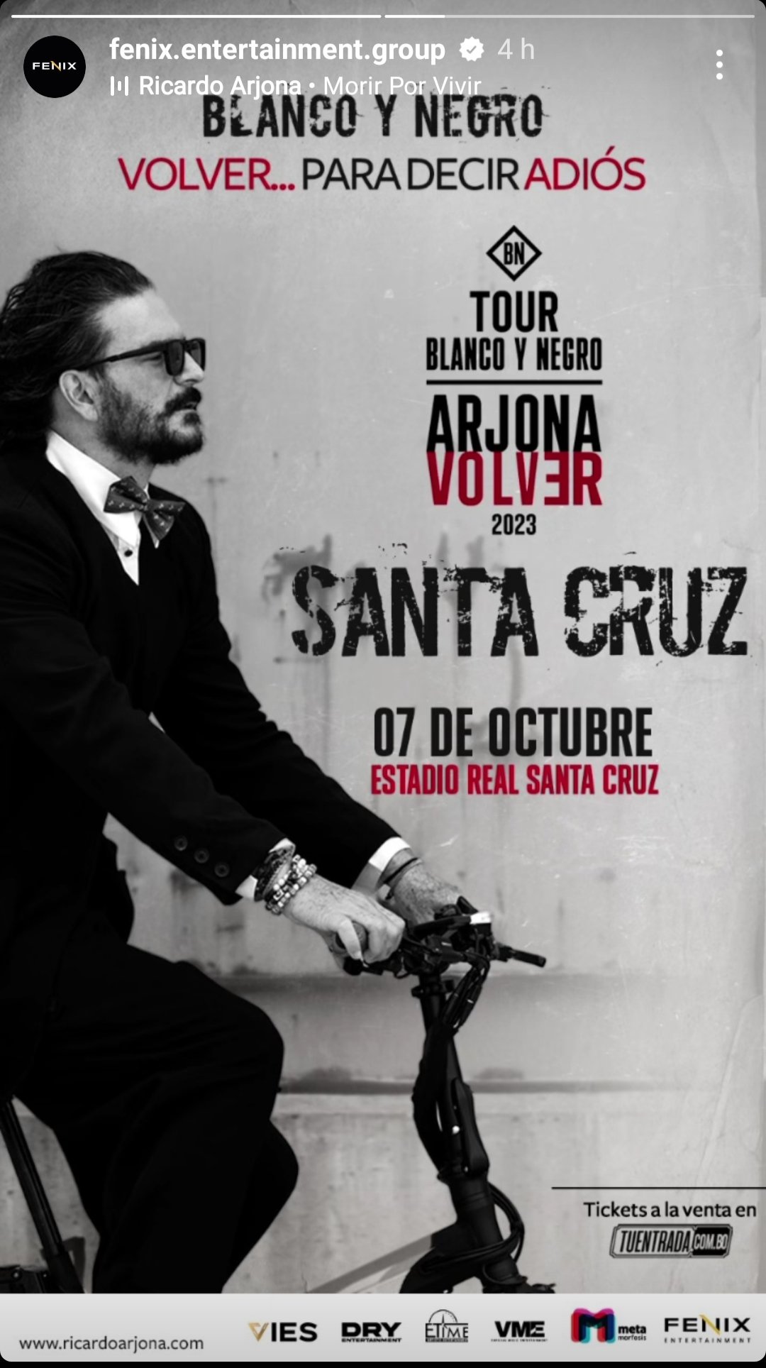 Y por si fuera poco, Ricardo Arjona también confirmó su presencia en suelo boliviano, para la presentación de su nuevo recital llamado “Blanco y Negro 2023”. Su presentación será en el estadio de Real Santa Cruz, el 7 de octubre del año en curso.