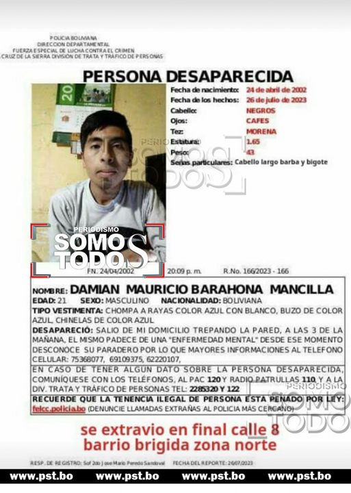 visto por última vez saliendo de su domicilio el pasado 26 de Julio. Si conoce algún dato de su paradero por favor llamar a:75368077