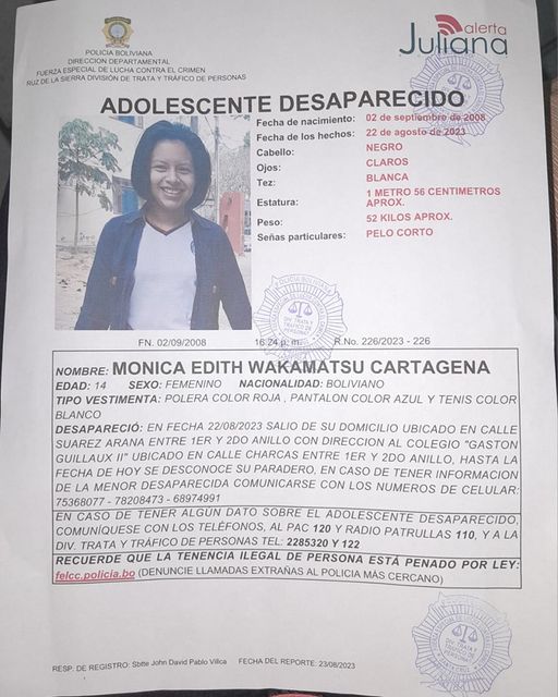Mónica Edith se encuentra desaparecida desde el martes 22 de este mes cuando salía de su domicilio ubicado en inmediaciones de la calle Suárez Arana entre 1er y 2do anillo con dirección al Colegio Gastón Guillaux ll ubicado en la calle charcas, sin embargo, hasta el momento no se sabe de su paradero y su familia se encuentra muy angustiada, si usted tiene algún dato o vio a la menor comuníquese a: