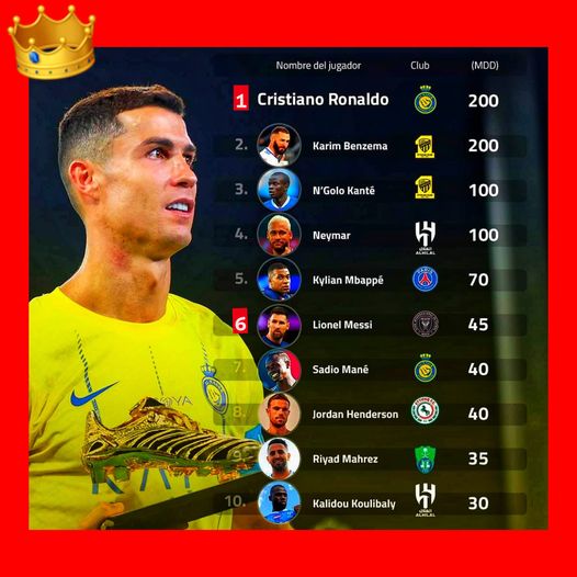 YA NO SOLO JUEGAN POR LA PLATA 🪙 La liga de Arabia Saudita 🐫 ha tenido un gran impacto en el juego global en los últimos meses, ya que continúa invirtiendo miles de millones 🫰 en fichajes de algunos de los mejores jugadores del mundo como CR7, Ney y Karim. Según Le Parisien, 8️⃣ de los 10 mejor pagados